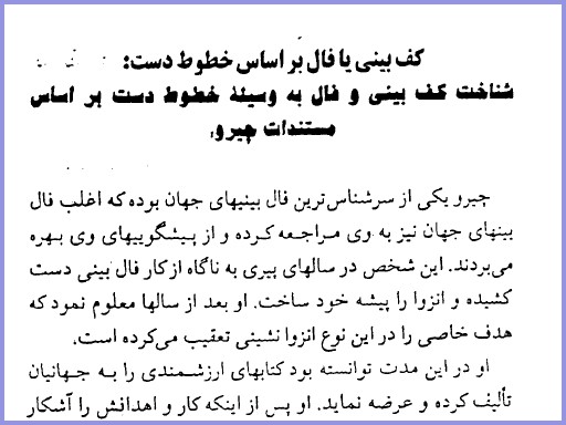 نام کتاب کف بینی یا فال بر اساس خطوط دست میباشد همچنین در این کتاب کف بینی و فال را با استفاده از خطوط کف دست تعبیر میکنند که بر اساس مستندات چیرو میباشد، چیرو یکی از مشهورترین فال بین و طالع بین جهان بوده است که بسیاری فال بینان جهان به او مراجعه میکردند.